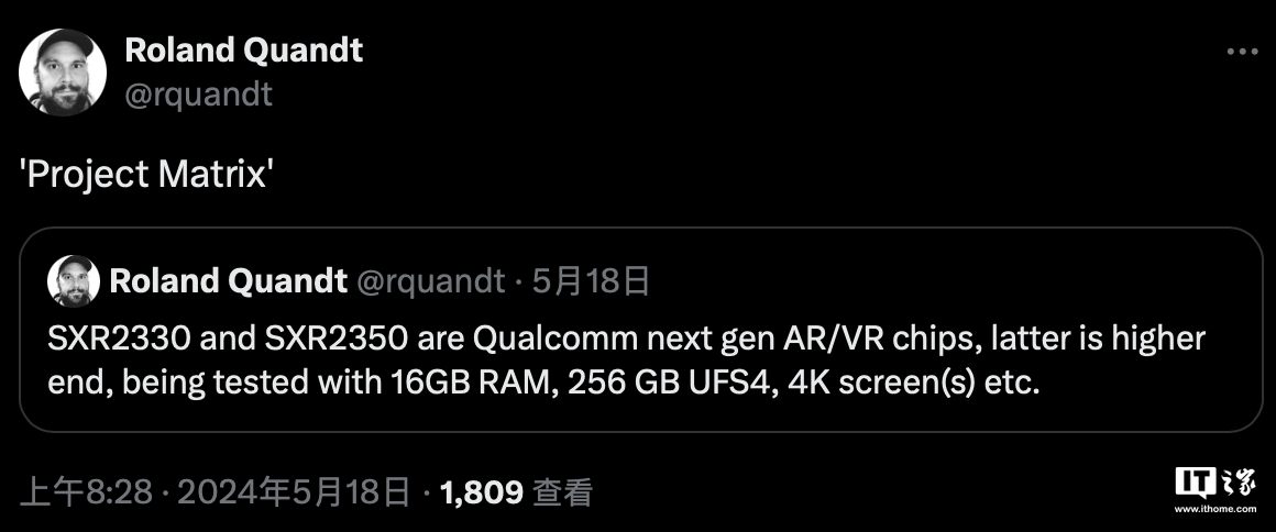5 月 22 日消息,VR 产业分析师 Roland Quandt 和 Brad Lynch 近日透露高通正在向 VR 头显制造商提供高通骁龙 XR2 Gen 3(SXR2330)和 XR2+ Gen 3 芯片(SXR2350)的测试样品,相关芯片代号为“Project Matrix”,支持 16GB RAM、UFS 4.0 和单眼 4K 面板。