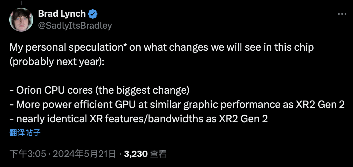 消息源 Lynch 透露,考虑到研发周期,相关芯片在功能和带宽上与 XR2+ Gen 2 “几乎相同”,但使用骁龙 X Elite 中的 Oryon CPU(而非 Arm Cortex),而 GPU 方面据称也将“更加节能”。
