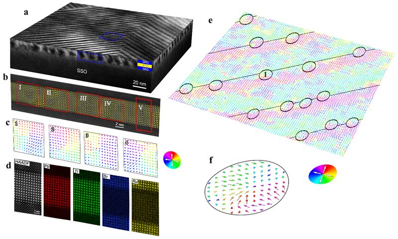 SmScO3 衬底上 SrRuO3/PbTiO3/SrRuO3 三层薄膜的截面样 (b-d) 和平面样 (e, f) 的像差校正透射电镜图像,展示了极化布洛赫点的原子尺度极化构型。