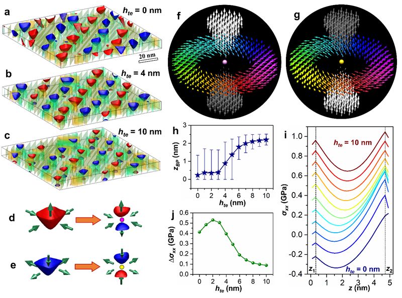 相场模拟预测上电极厚度的变化导致半子向布洛赫点转变 (a-e);(f, g) 两种布洛赫点的局域极化结构;(h) 布洛赫点的位置随电极厚度的变化;(i, j) 不同电极厚度的薄膜中的应力分布,表明弹性驱动力是导致半子向布洛赫点转变的主要原因。