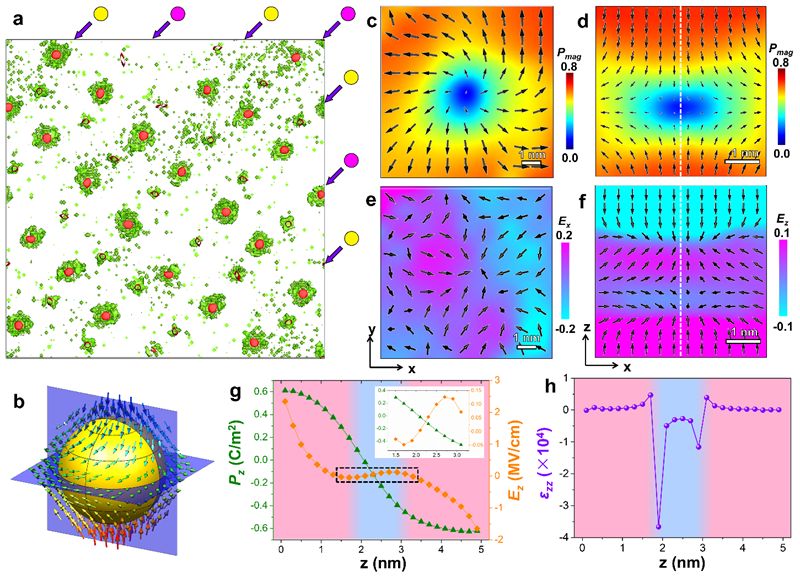 极化布洛赫点的负电容效应的相场模拟结果。(a) 负电容区域(绿色)和布洛赫点(红色)的分布;(b-f) 布洛赫点的极化构型图和电场分布图;(g, h) 穿过布洛赫点的极化、电场、介电常数分布曲线。本文图片由课题组供图。