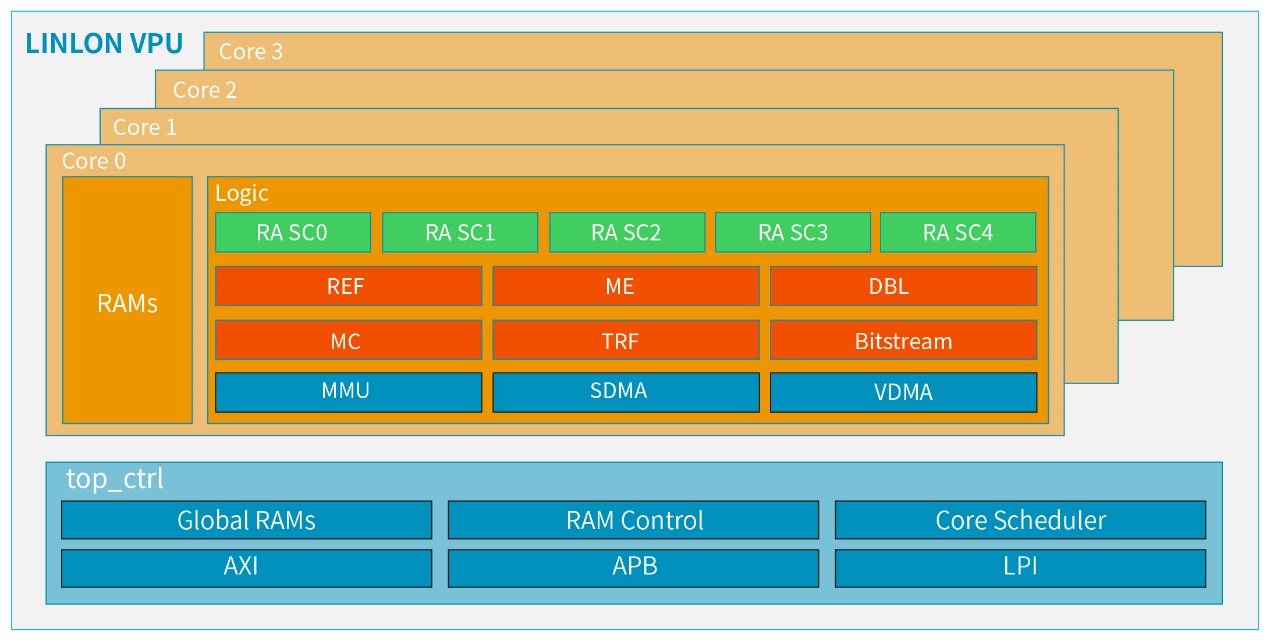 作为国内首批同时支持H.266标准的编码及解码视频处理器,“玲珑”V510/V710 VPU采用了多核多格式编解码融合的可编程处理架构,单核的编码或解码性能可达到每秒4K60帧,根据端、边、云等不同场景需求,分别提供1-4核、4-8核等多种配置。在大幅节省存储空间及带宽成本的同时,“玲珑”V510/V710 VPU还能轻松按需配置,确保系统性能、功耗和面积的最佳平衡。