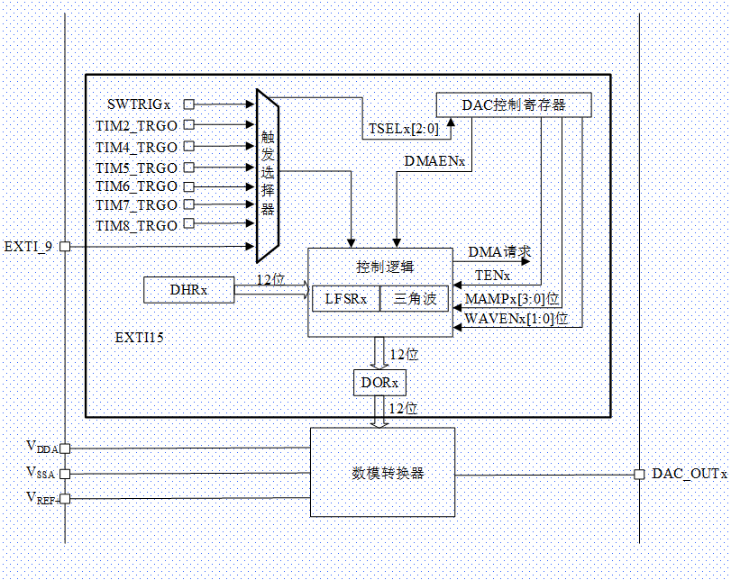 如果选择硬件触发(置位 DAC_CR 寄存器中的 TENx 位)可通过外部事件(定时计数器、外部中断线)触发转换。