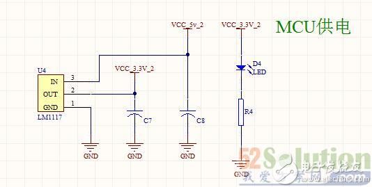 四轴飞行器要求整体设计质量较轻,体积较小,因此在电池的选取方面,采用体积小、质量轻、容量大的锂电池供电最合适。系统的核心芯片为STM32F103,常用工作电压为3.3V,同时惯性测量传感器,蓝牙通信模块的常规供电电压也为3.3V,锂电池的电压为11.4V,要使系统正常工作,需要将11.4V的锂电池电压稳压到3.3V。常用的78系列稳压芯片已不再适用,必须选择性能更好的稳压芯片。