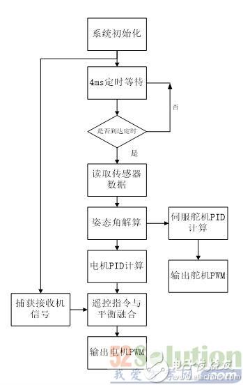 软件设计上由控制核心STM32F4读取传感器信息,解算姿态角,以姿态角为被控制量融合遥控信息后,输出到四个电机及两个舵机以完成四轴飞行控制和云台的稳定补偿。下图是软件流程: