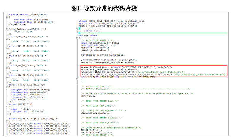 通过上一节的分析,明确了导致该问题的本质原因是内存地址没有对齐,这个内存地址实际上是代码中定义的全局变量 g_curPlaySound_app 指向的地址,也就是全局数组变量 SoundFile 的地址,在编译器不同的优化选项下,分配给 SoundFile 变量的地址是不一样的,在本案例中,编译优化选项 Level0 条件下,SoundFile 分配的地址没有按照WORD 对齐,而在优化选项 Level1 条件下,SoundFile 分配的地址是 WORD 对齐,所以在两种优化选项下,出现了不一样的运行结果。