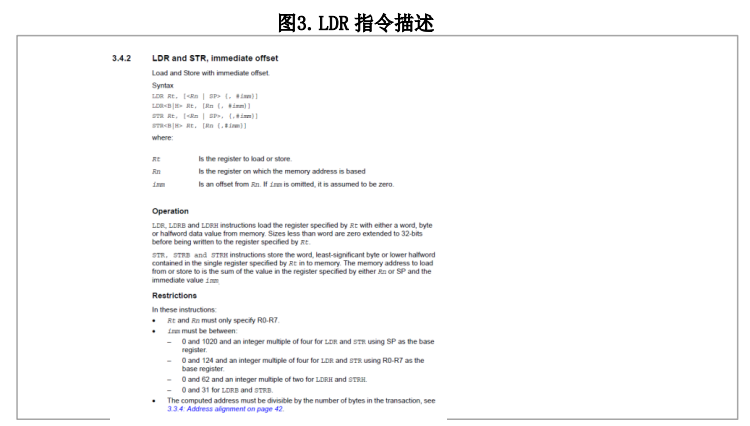 根据单步调试得知出现问题的语句为 LDR 指令,参考 Cortex M0 编程手册 PM0223 得知 LDR 指令的作用是从内存地址中加载一个 WORD 数据到目的寄存器 Rt 中,其中内存地址根据 Rn 或者 SP 寄存器的值以及立即数 imm 得到。