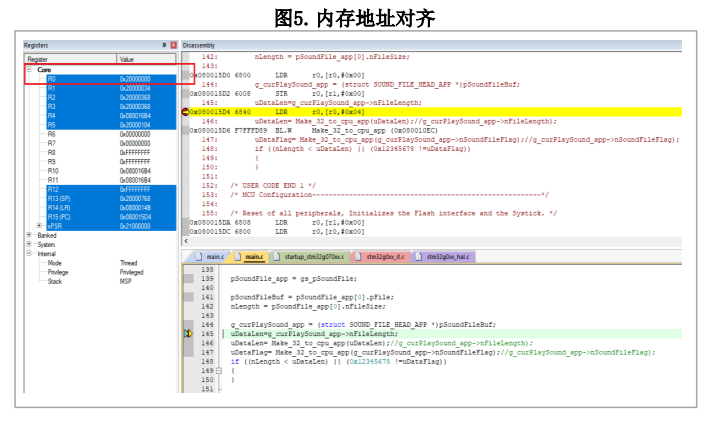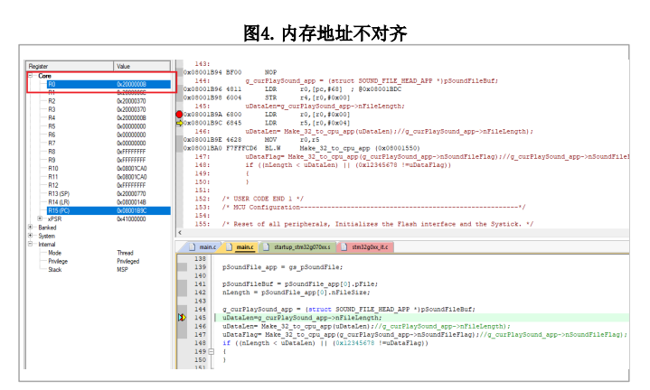 结合 LDR 指令的描述,在调试状态下,通过查看寄存器值,图 2 出错语句中根据 Rn和 imm 计算得到的内存地址为 R0=0x2000000B,imm=4 所以内存地址为 0x2000000F,很显然这个地址不是 4 字节对齐的。