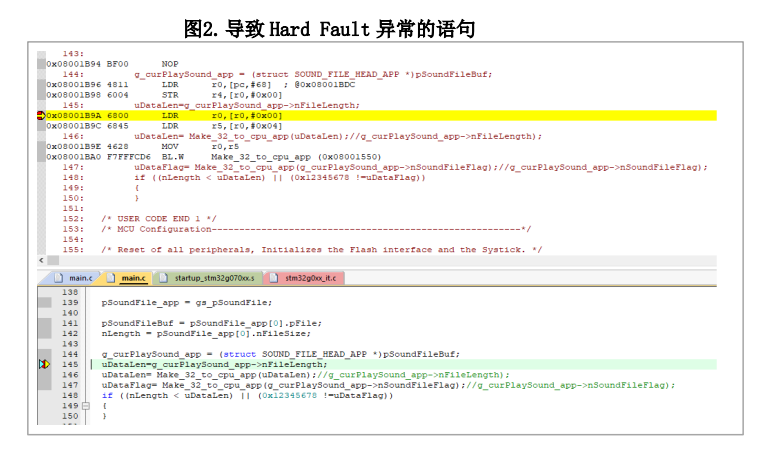 把客户提供的代码片段移植到 NUCLEO-G070RB 开发板上,问题很容易就复现了,代码本身功能简单,写法上也没有错误,所以从代码片段本身上看,无法确定问题出在哪里,通过 KEIL 调试器,在汇编窗口单步调试下,最终发现导致 HardFault 异常的语句为下图所示语句。