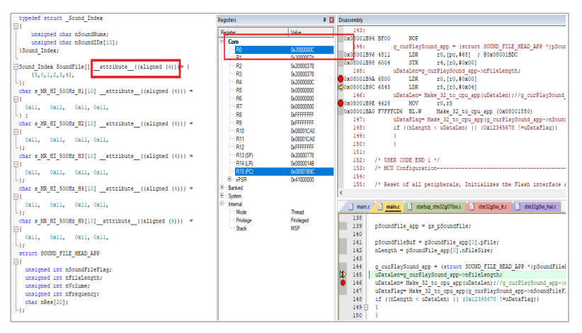 而当我们改变编译优化选项为 Level1 时,得到的内存地址为R0=0x20000000,imm=0x04 显然这个地址是按照 4 字节对齐的,所以这种情况下是不会出现 HardFault 异常的,印证了客户的问题现象。