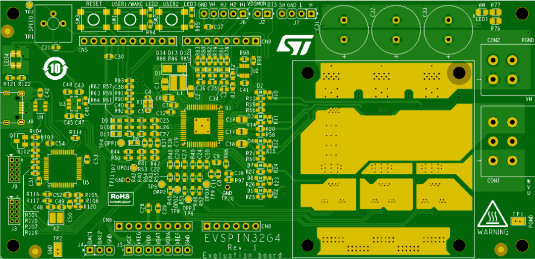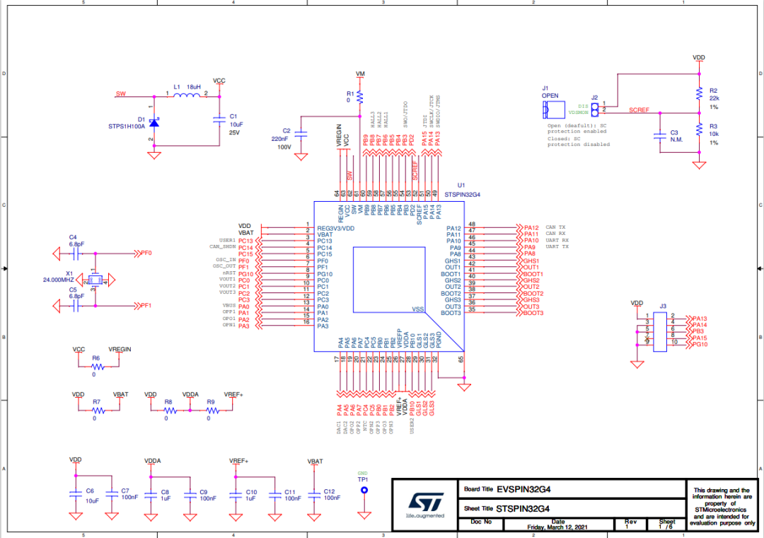 使用STM32G431微控制器做为主控芯片,STSPIN32G4 高性能半桥门驱动器做为电机驱动。STSPIN32G4使用9x9mm VFQFPN封装,具有丰富可编程功能,可实现电流传感,每个功率MOSFET的漏源极电压传感,以及过流保护,是做电机完全集成控制的解决方案。