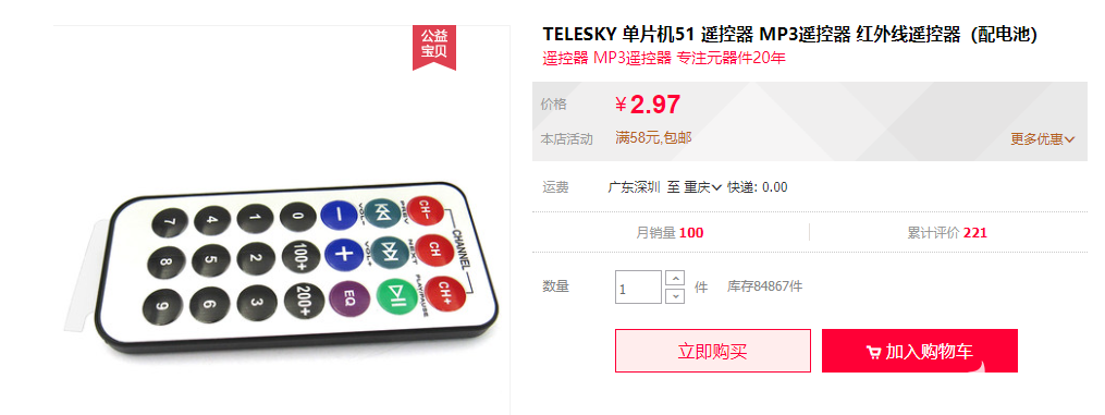 图1: 这是NEC协议的红外线遥控器: 如果自己手机没有红外线遥控器的功能,可以淘宝上买一个小遥控器来学习测试,成本不高,这个遥控器也可以自己做,能解码当然也可以编码发送,只需要一个红外光发射管即可。