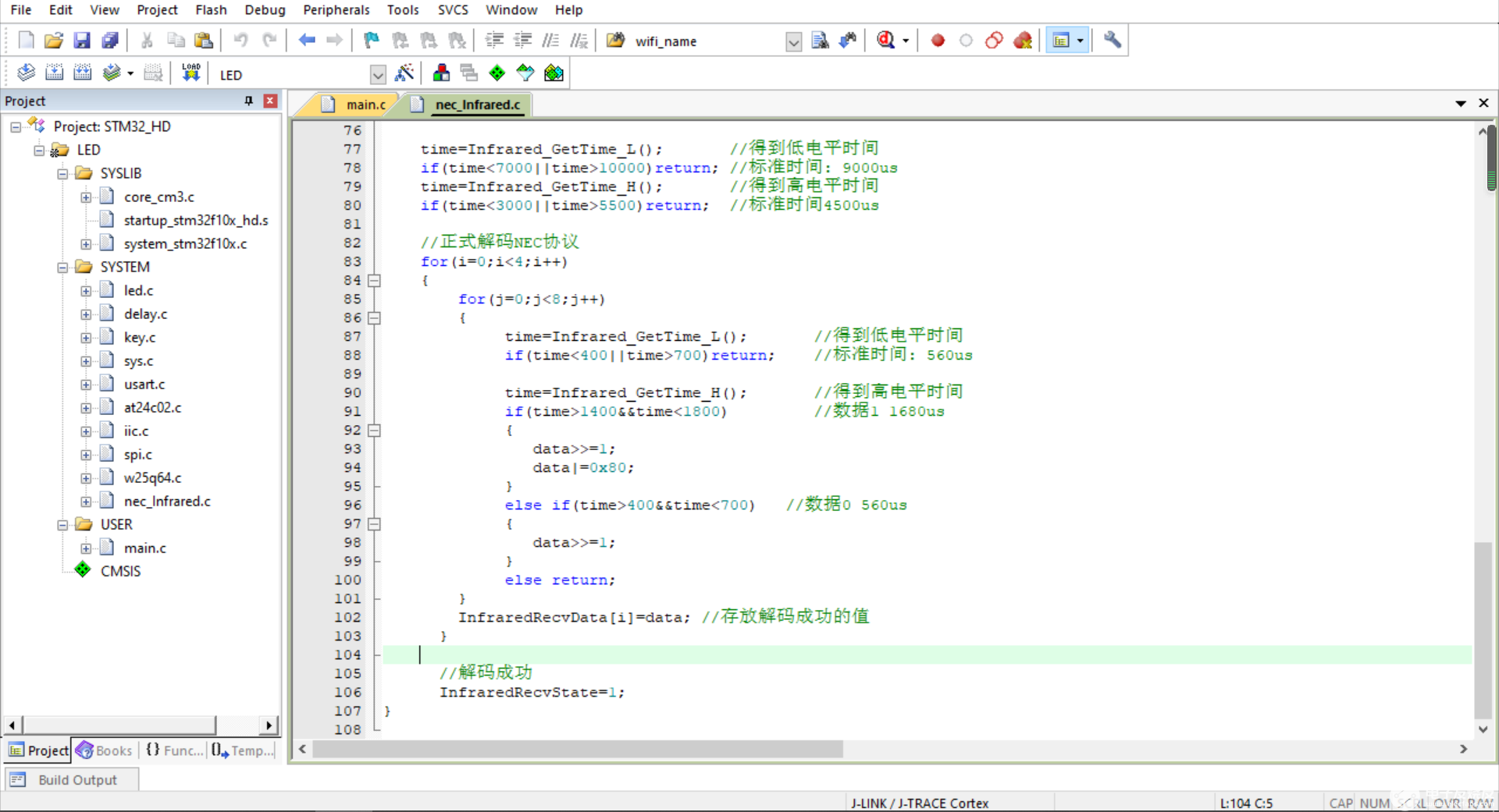 本程序的解码思路是: 将红外线接收模块的输出脚接到STM32的PB9上,配置STM32的PB9为外部中断模式,下降沿电平触发;如果收到红外线信号就进入到中断服务函数里解码,如果解码过程中发现数据不符合要求就终止解码,如果数据全部符合要求就按照协议接收,直到解码完成,设置标志位,在main函数里打印解码得到的数据。