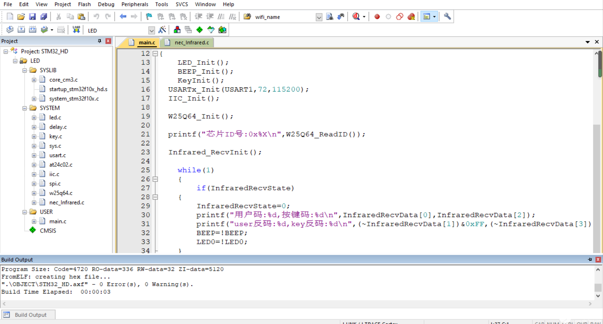 printf('用户码:%d,按键码:%dn',InfraredRecvData[0],InfraredRecvData[2]);