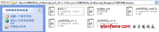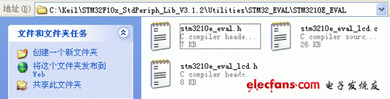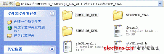 这里的stm32_eval.c,stm32_eval.h文件,以及图中所示三个文件夹中任意一个文件夹中的部分文件复制到第一个图所示的文件夹中去,这里我们选择stm3210e_eval这个文件夹。