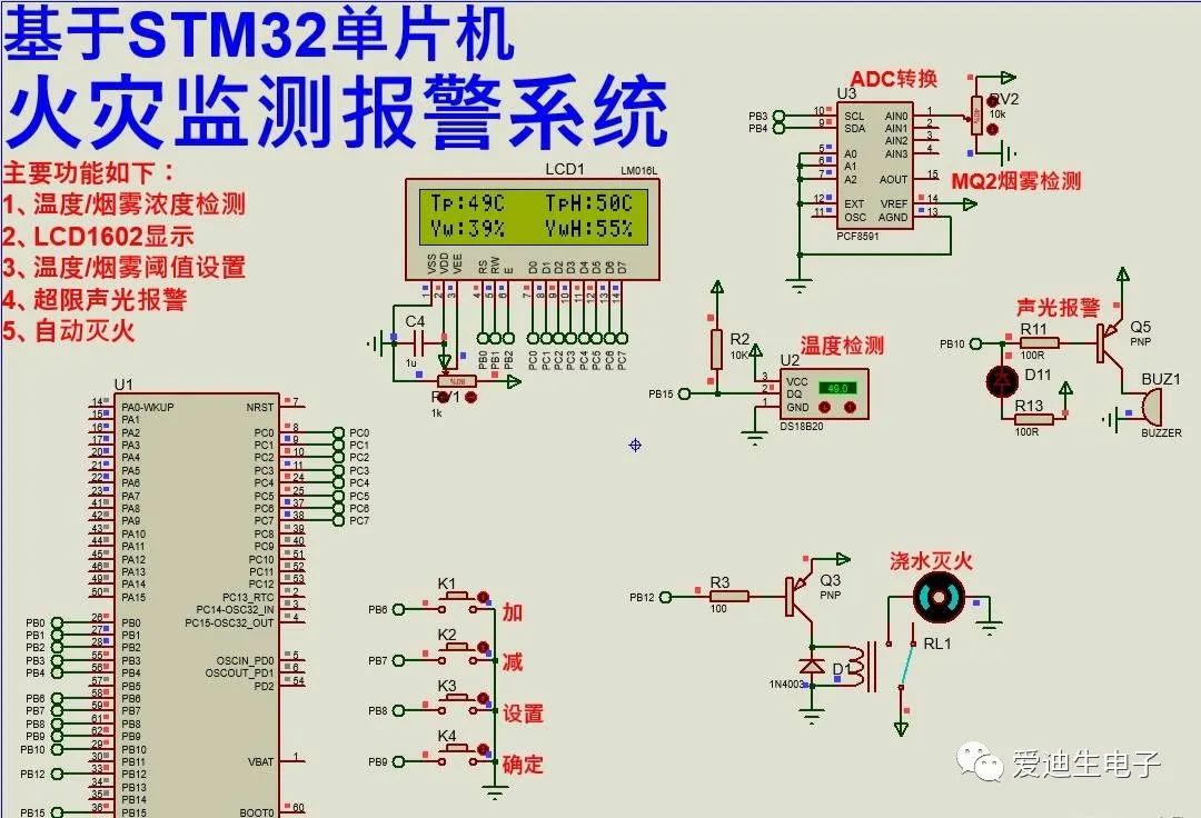 本项目使用Proteus8仿真STM32单片机控制器,使用LCD1602显示模块、按键模块、LED和蜂鸣器、继电器直流电机模块、DS18B20温度传感器、MQ2烟雾传感器等。