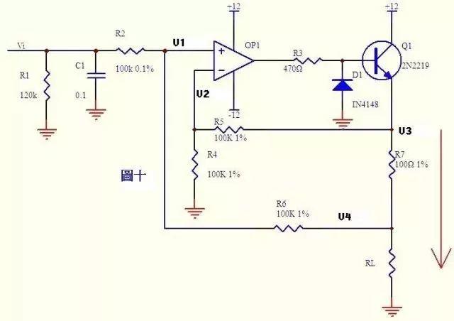 图1是一个电压转电流的典型电路。单片机输出PWM,控制Vi电压电平在0-3V之间,RL流过的电流为0-20ma。