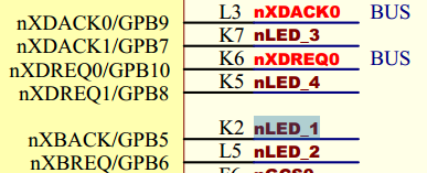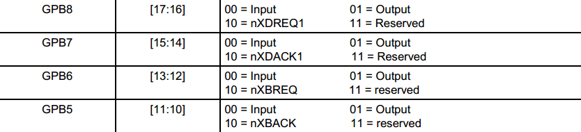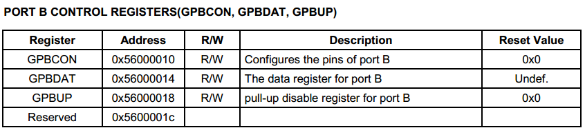 在S3C2440的引脚划分中,这四个引脚都属于Port B,因此可以通过配置Port B的控制寄存器对这四个引脚的功能进行配置: