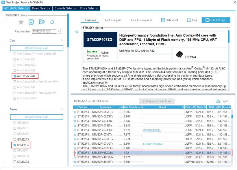 勾选 Arm Cortex-M4→STM32F4→STM32F407ZGTx: