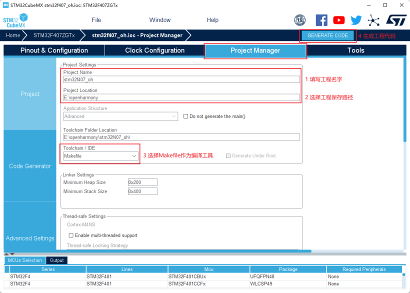 填写工程名称,选择工程保存路径,选择 Makefile 作为编译工具,点击 GENERATE CODE 生成工程代码。