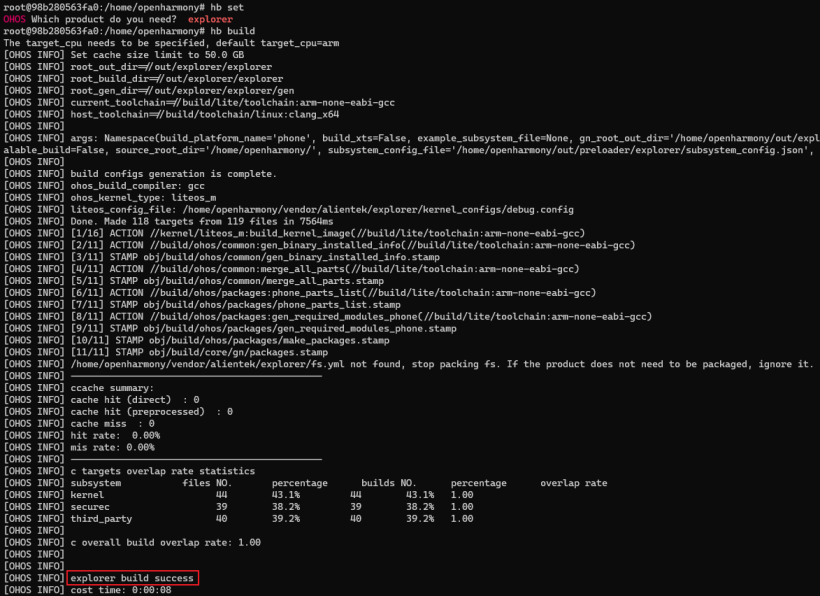 使用 hb 工具进行编译,hb set 选择编译目标,hb build -f 执行编译。