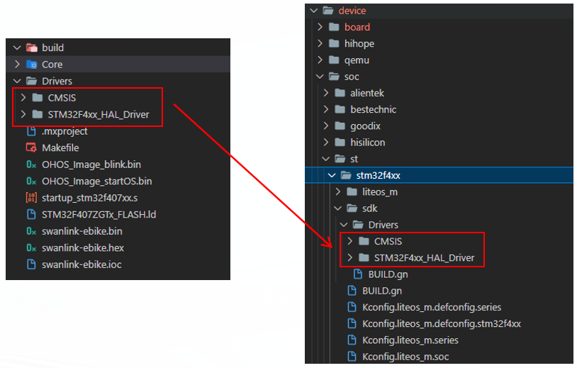 将 Drivers 中的 CMSIS、STM32F4xx_HAL_Driver 复制到 /device/soc/st/stm32f4xx/sdk/Drivers 中。