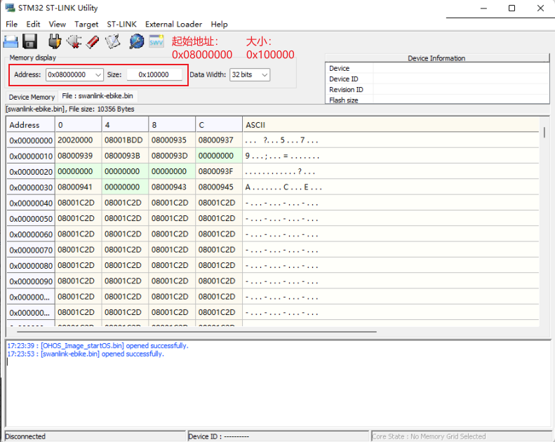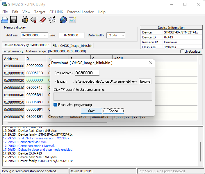 需要用到 ST-LINK 工具进行烧录,烧录时需要指定 flash,开始地址:0x08000000,大小:0x100000。