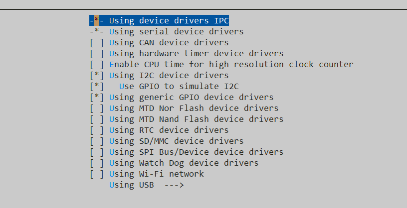 这是没有添加I2C底层驱动的原因。当时的情况是这样的,我在menuconfig配置环境中,Device Drivers子条目下,打开了I2C的驱动,如下图所示: