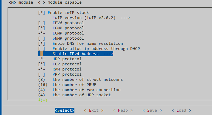 回到上层,如果设备虚拟文件系统打开了的话,关掉吧,用不上的。进入Network stack子条目,再进入LWIP子条目,选择LWIP的版本为2.0.2如果有路由器,现在就可以了,如果没有,需要配置静态IPv4地址。如图所示: