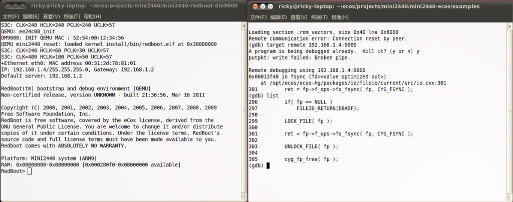 根据雪松的修改,现在可以用arm-eabi-gdb 的target remote来做ecos 应用程序的单步调试了