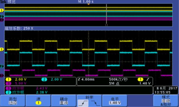 客户最初发现使用该配置控制电机时,在某一时刻会出现电机转速异常。经过抓取波形发现,HALL Sensor和捕获输出波形(在中断中翻转IO)不匹配,在某个时刻,会出现“中断丢失”现象,表现为捕获输出高电平或低电平周期被拉长,如图1所示。黄色为HALL信号,绿色为捕获中断输出,紫色为OC中断输出,可以明显看到在第四个上升沿之后,高电平长度被拉长半个周期。客户怀疑是硬件Bug导致中断“同时发生”时,捕获“中断丢失”,从而导致该问题。