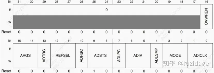 / CFG寄存器 * bit16 0 关闭复写功能 * bit15:14 00 硬件平均设置为默认值,00的时候4次平均, * 但是得ADC_GC寄存器的AVGE位置1来使能硬件平均 * bit13 0 软件触发 * bit12:1 00 参考电压为VREFH/VREFL,也就是3.3V/0V * bit10 0 正常转换速度 * bit9:8 00 采样时间2/12,ADLSMP=0(短采样)的时候为2个周期 * ADLSMP=1(长采样)的时候为12个周期 * bit7 0 非低功耗模式 * bit6:5 00 ADC时钟源1分频 * bit4 0 短采样 * bit3:2 10 12位ADC * bit1:0 11 ADC时钟源选择ADACK / / GC寄存器 * bit7 0 先关闭校准功能,后面会校准 * bit6 0 关闭持续转换 * bit5 0 关闭硬件平均功能 * bit4 0 关闭比较功能 * bit3 0 关闭比较的Greater Than功能 * bit2 0 关闭比较的Range功能 * bit1 0 关闭DMA * bit0 1 使能ADACK /