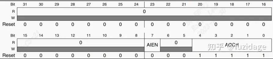 AIEN(bit7):转换完成中断控制位,为 1 的时候打开转换完成中断,为 0 的时候关闭。 ADCH(bit4:0):转换通道选择,可以设置为 00000~01111 分别对应通道 0~15。11001 为内部通道,用于 ADC 自测。