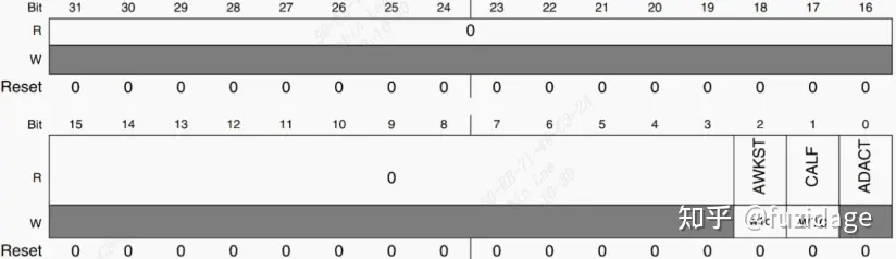 AWKST(bit2):异步唤醒中断状态,为 1 时表示发生了异步唤醒中断。为 0 时没有发生异步中断。 CALF(bit1):校准失败标志位,为 0 的时候表示校准正常完成,为 1 的时候表示校准失败。 ADACT(bit0):转换活动标志,为 0 的时候表示转换没有进行,为 1 的时候表示正在进行转换。