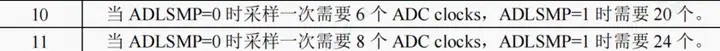 ADTRG(bit13):转换触发选择。为 0 的时候选择软件触发,为 1 的时候,不选择软件触发。 REFSEL(bit12:11):参考电压选择,为 00 时选择 VREFH/VREFL 这两个引脚上的电压为参考电压,正点原子 ALPHA 开发板上 VREFH 为 3.3V,VREFL 为 0V。 ADHSC(bit10):高速转换使能位,当为 0 时为正常模式,为 1 时为高速模式。 ADSTS(bit9:8):设置 ADC 的采样周期,与 ADLSMP 位一起决定采样周期: