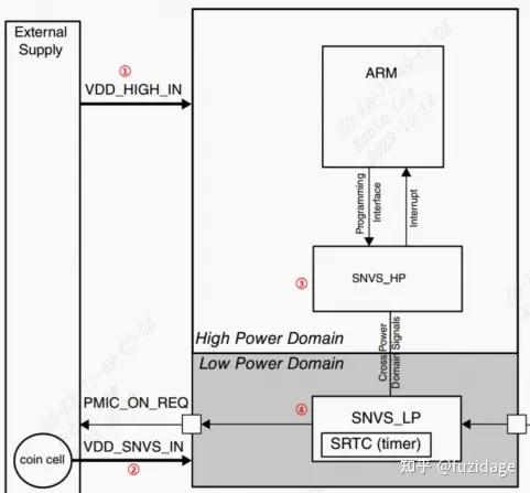 系统主电源断电以后 SNVS_HP 也会断电,但是在备用电源支持下,SNVS_LP 是不会断电的,而且 SNVS_LP 是和芯片复位隔离开的,因此 SNVS_LP 相关的寄存器的值会一直保存着, 也就是low Power Domain是不受系统电源影响。 上图各个序号含义如下: ①、VDD_HIGH_IN 是系统(芯片)主电源,这个电源会同时供给给 SNVS_HP 和 SNVS_LP。 ②、VDD_SNVS_IN 是纽扣电池供电的电源,这个电源只会供给给 SNVS_LP,保证在系统主电源 VDD_HIGH_IN 掉电以后 SNVS_LP 会继续运行。 ③、SNVS_HP 部分。 ④、SNVS_LP 部分,此部分有个 SRTC,这个就是要使用的 RTC。 SRTC 需要外界提供一个 32.768KHz 的时钟,I.MX6U-ALPHA 核心板上的 32.768KHz 的晶振就是提供这个时钟的。