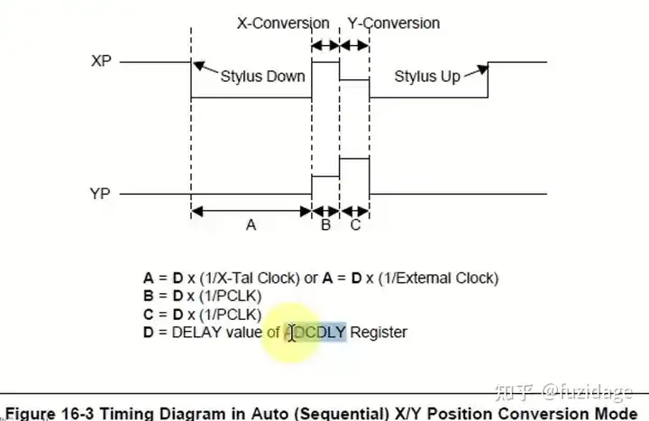 可以看到可以看到,进行auto or manual measure 坐标转换的时序要满足:A = Dx,D表示ADCDLY的值。 现在晶振的频率是12Mhz, 那么根据触摸屏规格书我们取A= 5ms,那么D= 0.005s *12*1000000 = 60000,所以ADCDLY配置成60000.