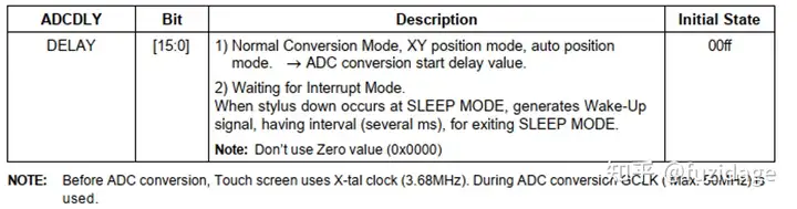 由于可能触摸屏采样的转换速率问题,按下后需要过一段电压才能稳定下来,那么数据才能稳定可能需要一定的延迟,所以需要配置ADC delay,让ADC慢一点产生中断,也就是等坐标稳定后在通知用户。