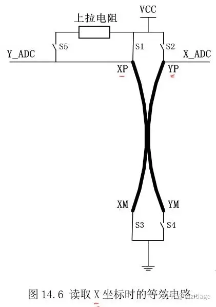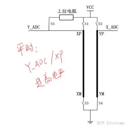 一、电阻触摸屏原理 触摸屏包含上下叠合的两个透明层,一般覆盖在lcd表面,两个透明层是由均匀的电阻介质组成,如下图。 当触摸屏表面受到的压力(如通过笔尖或手指进行按压)足够大时,顶层与底层之间的薄膜会产生接触,此时会形成x方向和y方向的坐标。那么x,y坐标的值是怎么得来的呢?本质上就是通过ADC转换得来的。详解如下: 触摸屏的等效电路可以看成如下图: 计算触点的X,Y坐标分为如下两步(见下图): 1.计算Y坐标: 在Y+电极施加驱动电压Vdrive, Y-电极接地,由于上下两层膜形成触点,X+做为触点的引出端,测量得到接触点的电压,触点电压与Vdrive电压之比等于触点Y坐标与屏高度之比。如下图: 2.计算X坐标: 在X+电