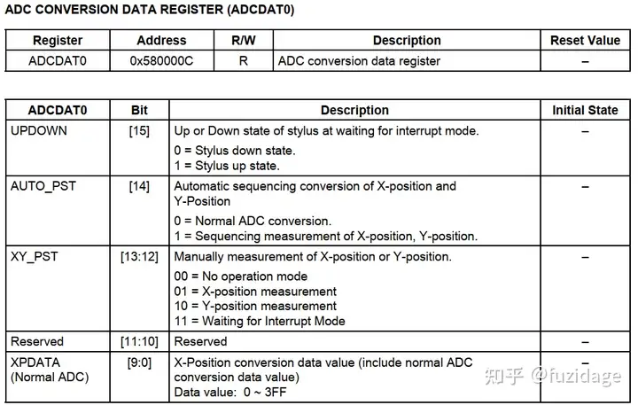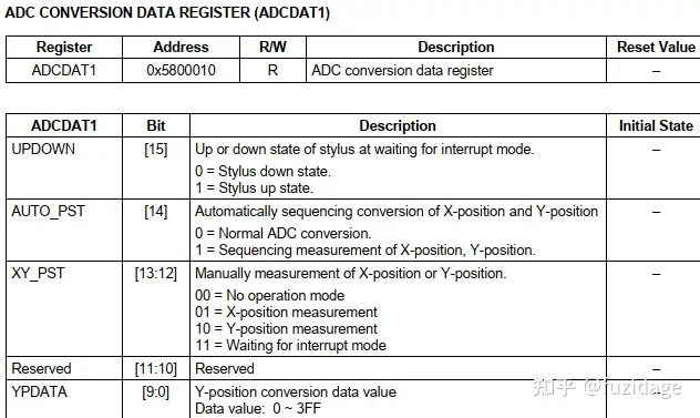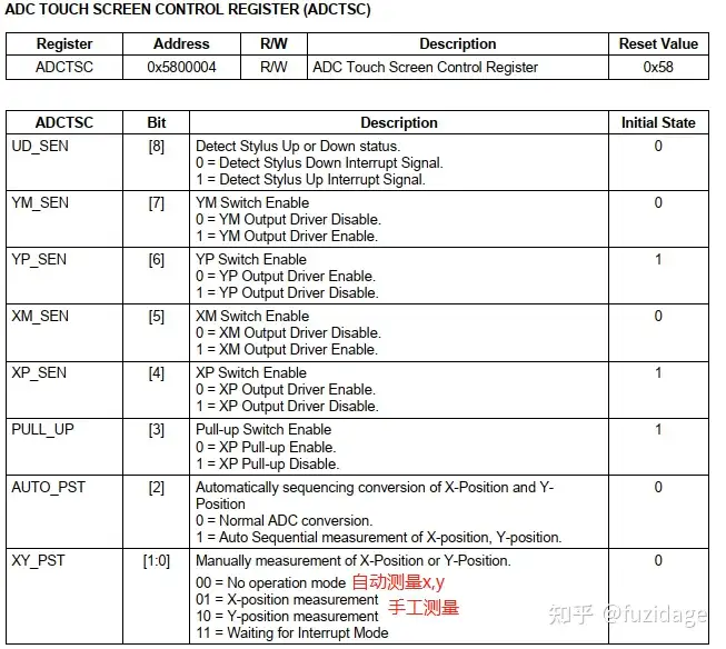 等待中断模式 。可以设置rADCTSC=0xd3;也就是对应下图寄存器 // XP_PU, XP_Dis, XM_Dis, YP_Dis, YM_En.当产生中断信号(INT_TC)后,等待中断模式必须清除.(即XY_PST sets to the No operation Mode).