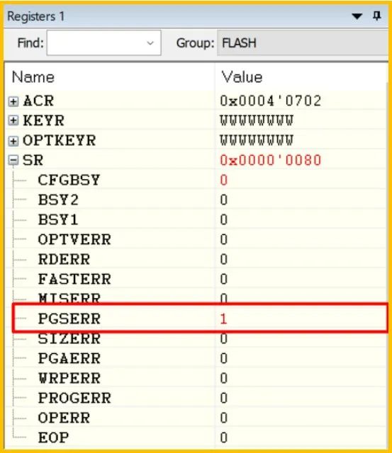 客户项目中使用的 MCU 型号是 STM32G0B1, 他们反馈在代码中尝试擦除并编程 FLASH时, 发现 FLASH 的状态寄存器显示编程错误(如图 1 所示). 问题是当前代码还没有开始擦除和编程, 怎么就有了编程错误标志了呢 ? 如果不将此错误标志清除, 后续的编程操作无法继续.客户对于每次想要操作 FLASH 之前这个清除动作既感觉多余也感觉别扭, 且还不得不做, 且做了也不知对整个产品的稳定性会有什么样的影响 ?