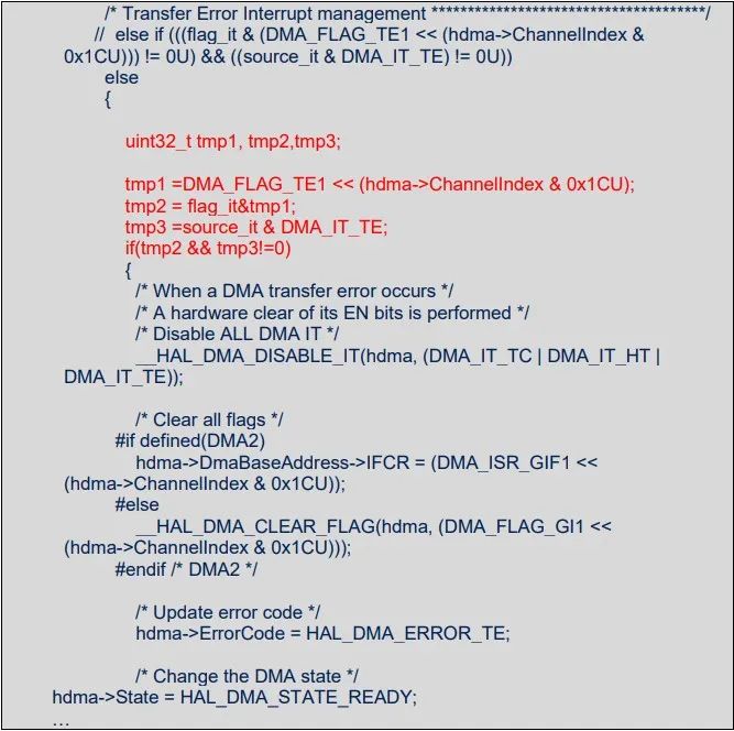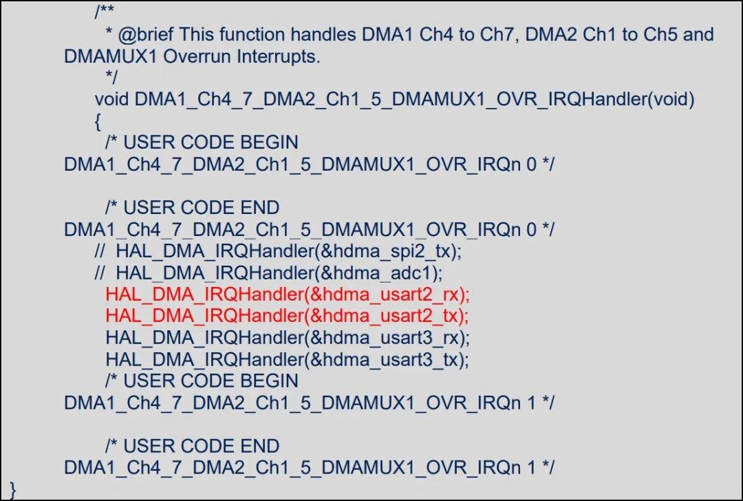 访问客户时, 客户也曾私下里反馈, 经常在网络论坛上获取类似这种问题, 客户怀疑是不是STM32 本身就存在某些未曾公开的问题 ? 其实, STM32 的所有问题都已公开在勘误手册中, 如果客户的问题在勘误手册中没找到, 那么极有可能是自己代码哪里出了问题。 问题分析及测试 查看客户的工程, 由于客户的工程相当庞大, 各个模块和任务相互交叉, 一时半刻是很难从如此庞大的工程中找出问题, 更麻烦地是, 客户的电脑是有加密系统的, 导致在工程内查找任何字符和函数都相当痛苦. 好在是, 问题能够稳定地复现。 于是尽量精简客户的代码, 将所有不相关的任务,模块统统移除掉, 并且保持问题能够重现. 并使其能够在 ST 官方的 NUCLEO 板上重现. 这样一来, 就完全可以脱离客户原来的硬件环境进行测试. 由于客户的环境非常不利于查找问题, 效率事倍功半. 于是, 将客户的最小化工程提取出来(与软件泄密无关), 并拿到办公室进行测试. 很快就找到了问题所在。 原来客户的工程中有用到两个串口, 串口 2 和串口 3, 都是使用的 DMA 模式。客户不同的软件人员负责不同的模块, 最终在整合代码时, 串口 2 并没有使用, 所以串口 2 对应的初始化代码是删除掉的, 但由于串口 2 和串口 3 的 DMA 中断是共用一条中断线, 是相同的中断入口, 在中断处理时,串口 2 的 DMA 处理函数和串口 3 的处理函数都会一起处理. 问题就出在串口 2 的 DMA 中断处理并没有移除 。如 stm32g0xx_it.c 文件 :