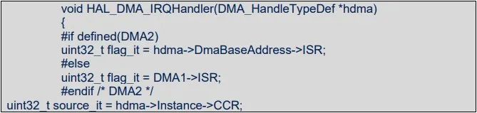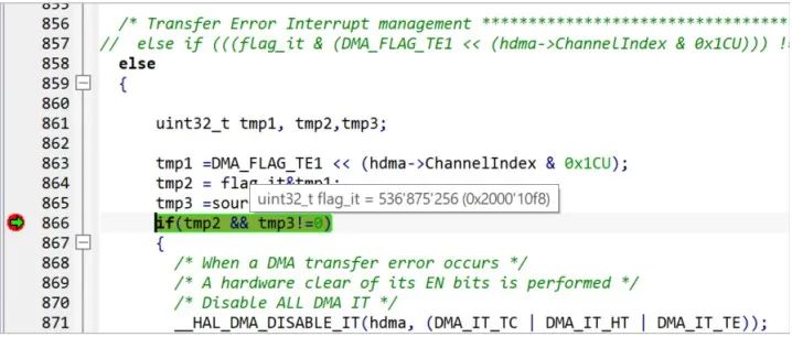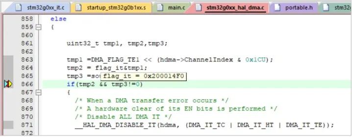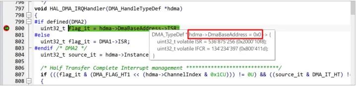如上所示, flag_it 的值来自 hdma->DmaBaseAddress->ISR, 原来是 DMA 相关 ISR 寄存器的值, 但实际调试如下: