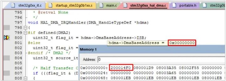 如上 IAR 调试环境下, 出错时, hdma->DmaBaseAddress 实际指向的是地址 0, 其成员 ISR为其第一个成员, 实际也就是地址 0 上的数据. 我们都知道, 在默认情况下, MCU 的地址 0 默认是映射到内部 FLASH 的首地址 0x0800 0000 上的, 而此地址一般保存的是栈顶.。也就是说, IAR 编译环境下, 地址 0 指向栈顶地址 0x2000 10f8。 对应地, 在 KEIL 调试环境下: