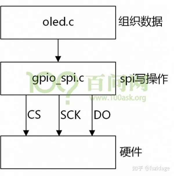 gpio_spi.c来实现gpio模拟spi,负责spi通讯。对于OLED,有专门的指令和数据格式,要传输的数据内容,在oled.c这一层来实现,负责组织数据。