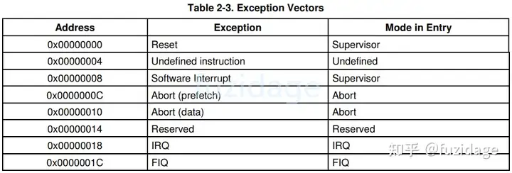 我们知道cpu一上电会跳到0地址(reset复位)执行代码,此时CPU处于svc模式,2440异常向量表如下图所示: