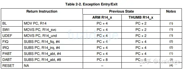 * 1. lr_svc保存有被中断模式中的下一条即将执行的指令的地址