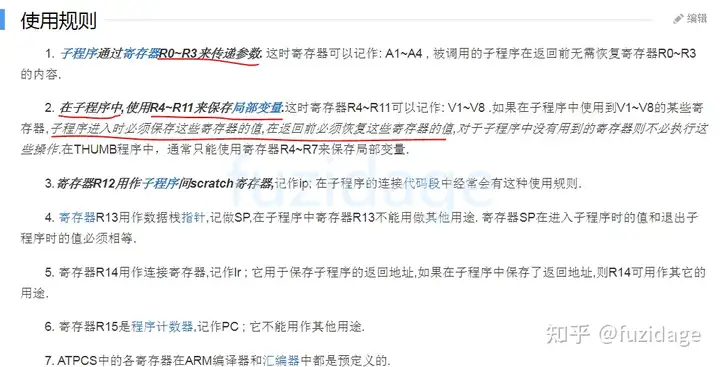 我们知道当调用‘bl printException’可能会修改某些寄存器,但是又会恢复这些寄存器,那么得知道它会保护哪些些寄存器。 我们来看下ATPCS规则: