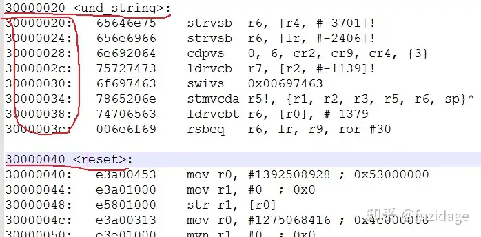 我们再来看看反汇编,发现reset的地址是30000040,是以4字节对齐的,再次烧录运行,发现能够正常输出print1, 能够进入未定义指令异常。
