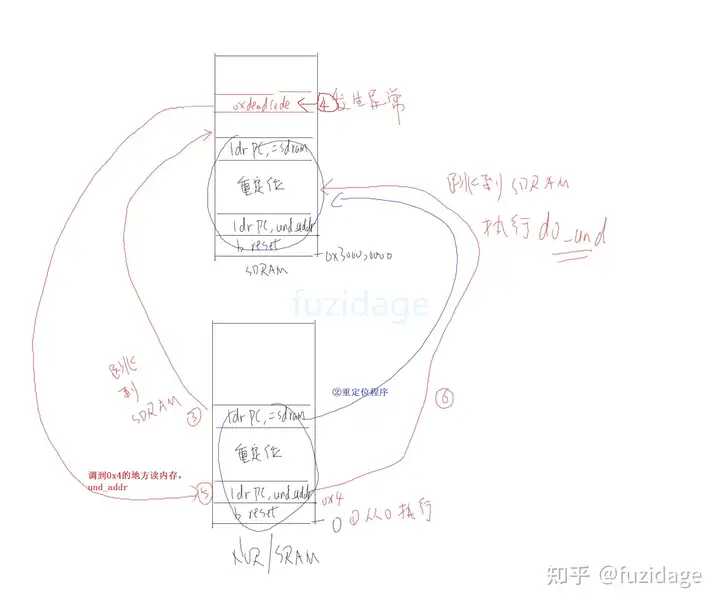 2.进入指令异常服务程序do_und后,我们需要保存现场,处理und异常,恢复现场,注意:由于发生了cpu模式切换,如果要用到栈,那么先要设置对应模式的栈。由于栈的地址是向下生长的,这里我就用sdram的末位地址作为栈指针,把sp_und=0x34000000。